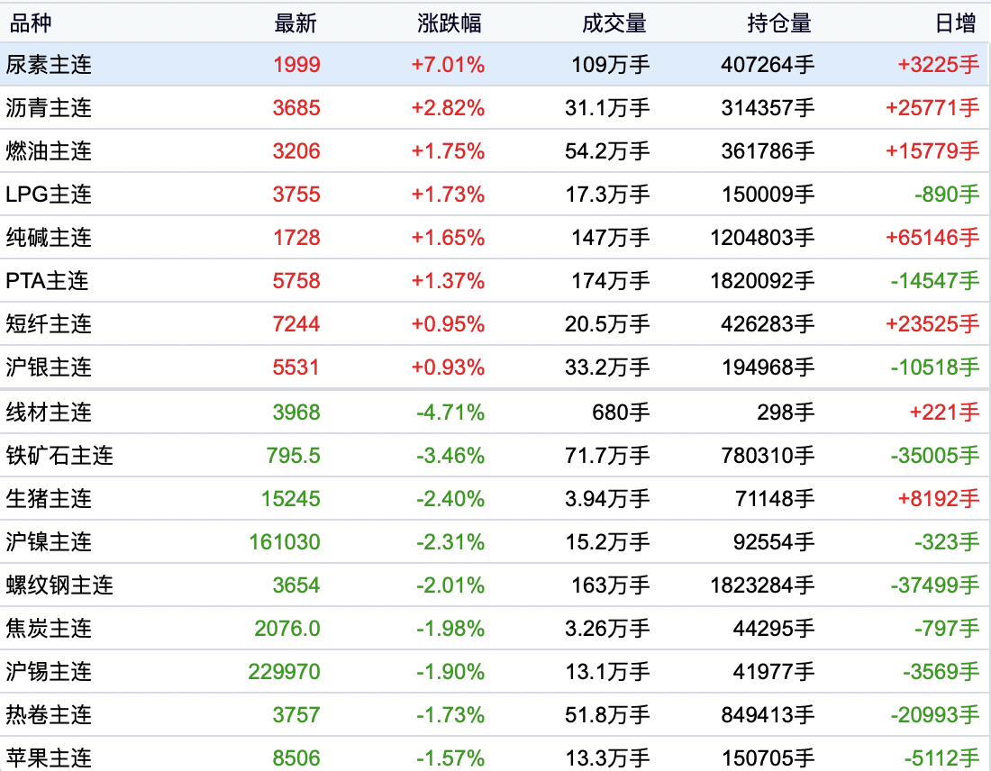 商品期货收盘互有涨跌,尿素涨停,涨幅7%,沥青、原油涨超2%,液化气、燃料油、纯碱、PTA、LU燃油涨超1%;铁矿石跌超3%,生猪、沪镍、螺纹钢跌超2%。