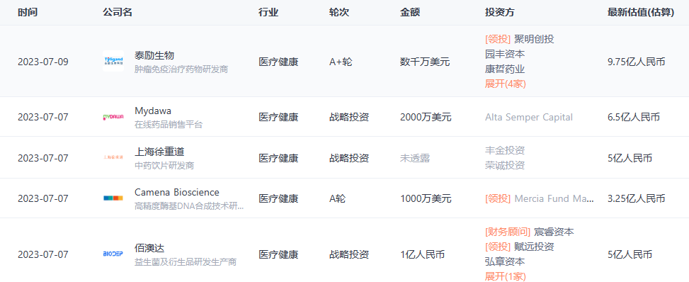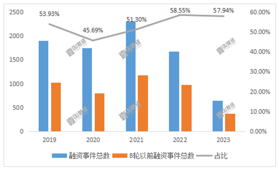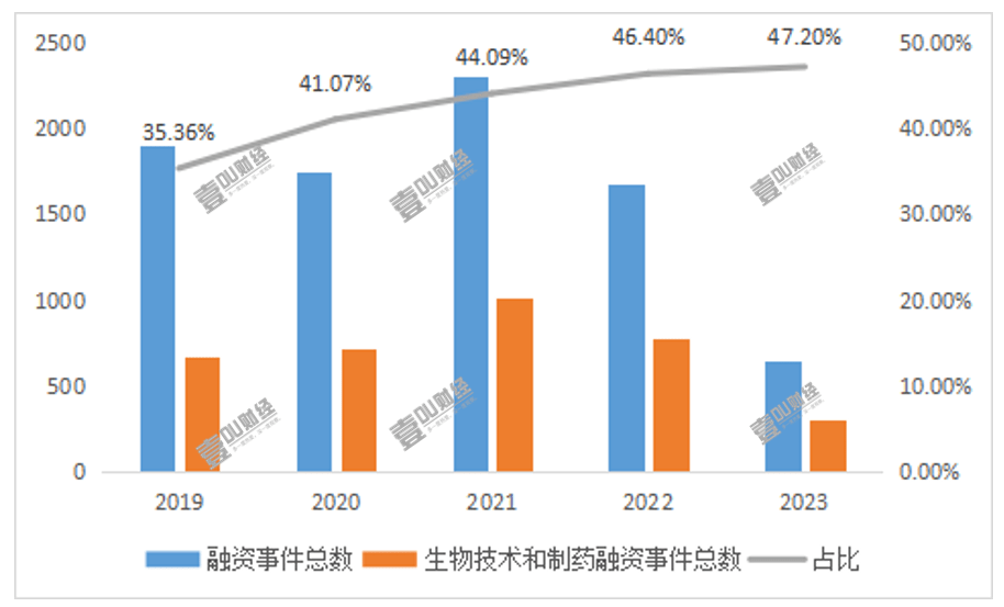 同时,在“投早”的驱动下,投“技术”也随之成为了当下必然的投资风格。作为医疗健康行业技术方面的代名词,“生物技术和制药”的融资数量占比越来越高,2023年较2019年净增长了11.84pct。大多数技术研发类的企业往往在早期因资金短缺而难以持续,而在如今大环境下投资人“被迫”将目光转向了了技术赛道,对于医药、医疗健康行业来说反倒是一种“因祸得福”了。