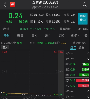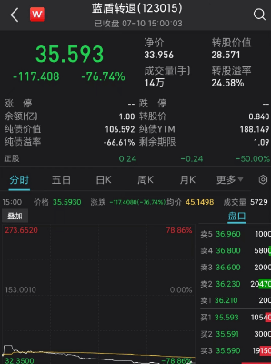 截至收盘,蓝盾转退价格报35.59元,日内大跌76.74%。而其正股*ST蓝盾也变成了蓝盾退(蓝盾股份),低开37.5%。截至收盘,蓝盾退股价遭腰斩,报0.24元。