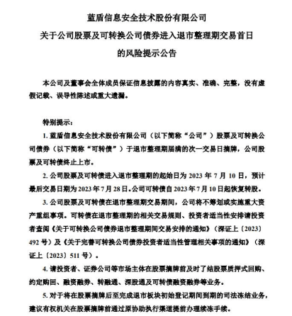 7月9日晚间,蓝盾股份发布公告称公司股票及可转债进入退市整理期的起始日为7月10日,预计最后交易日期为7月28日,公司可转债自7月10日起恢复转股。蓝盾股份在公告“委婉”的提示风险,截至2022年底,公司短期借款、一年内到期的非流动负债分别为18.69亿元和10.18亿元, 绝大部分处于逾期状态;银行借款逾期期限均超过一年;公司货币资金余额为0.54亿元,其中使用权未受限的货币资金0.10亿元, 明显低于“蓝盾转债”剩余本金余额。