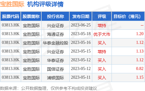 截至2023年7月10日收盘,宝胜国际(03813.HK)报收于0.58港元,上涨0.0%,换手率0.0%,成交量18.2万股,成交额10.55万港元。投行对该股的评级以买入为主,近90天内共有4家投行给出买入评级,近90天的目标均价为1.09港元。兴业证券最新一份研报给予宝胜国际增持评级。
