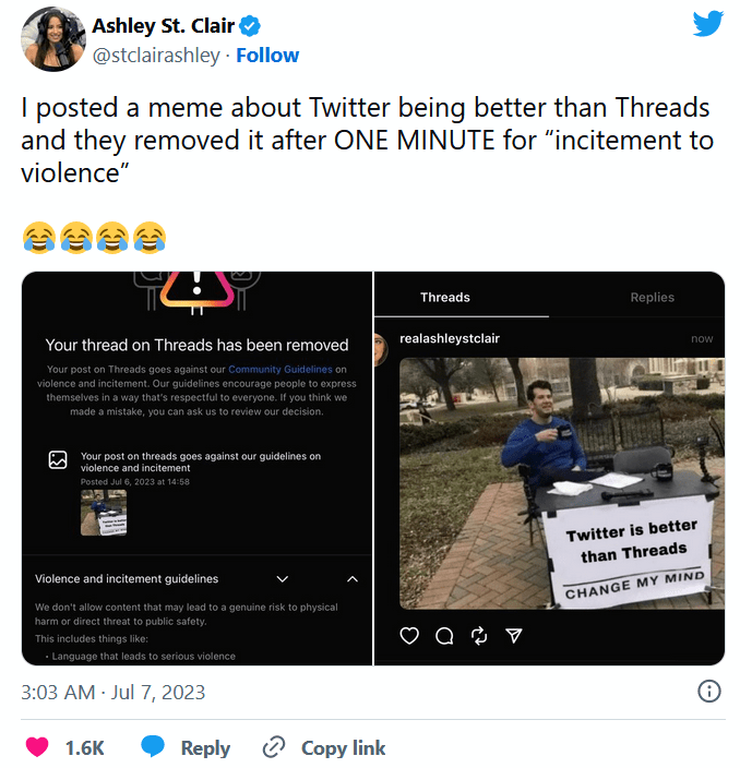 美国保守派评论员圣克莱尔(Ashley St. Clair)发Threads表示:“我发了一条关于推特比Threads好的梗图,但他们在一分钟后因为‘煽动暴力’而删除了它。”