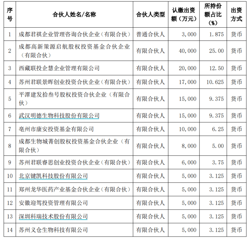 公告显示,成都君蓉康合伙企业成立于2022年10月,认缴出资总额为人民币16亿元,全部为货币出资,分期缴付。聚焦创新药及生物技术、医疗器械及诊断技术、专业服务及供应链,重点关注早期创新、供应链本土化、国际化方向的投资。