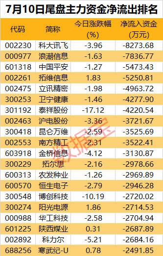 尾盘没有个股资金流出额超亿元,科大讯飞、浪潮信息两只人工智能概念龙头流出额居前。中国平安、拓维信息则流出超5000万元。