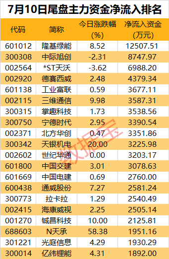 个股方面,尾盘仅有隆基绿能净流入超亿元,为1.25亿元。CPO龙头中际旭创尾盘资金回流,流入额超8000万元。*ST天沃、德赛西威、工业富联、三维通信等个股均有超3000万元的资金流入。