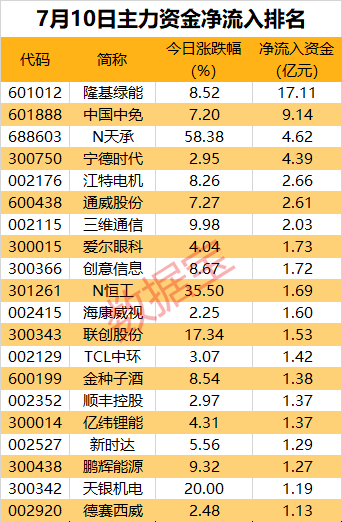 从个股看,今日有23股资金流入超亿元,隆基绿能流入金额最高,达到17.11亿元;中国中免流入额次之,为9.14亿元;N天承、宁德时代流入额则超4亿元。