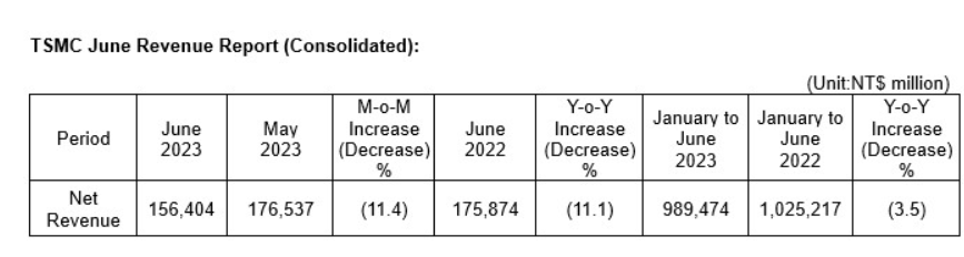 2023年1月至6月,台积电营收总计9894.7亿元新台币(当前约 2285.68 亿元人民币),较2022年同期减少 3.5%。