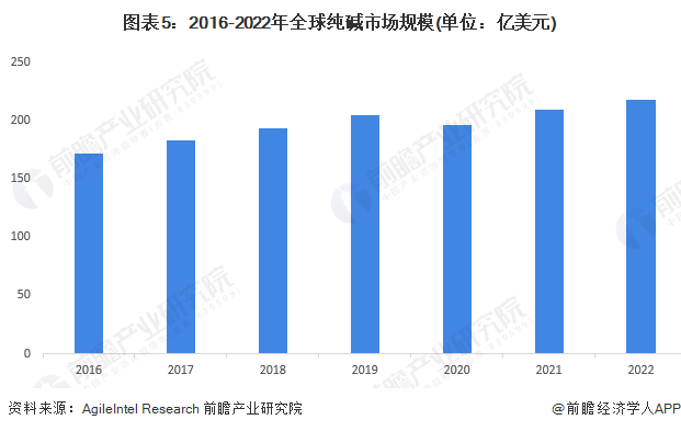 2016-2022年全球纯碱市场规模波动上升,2020年小幅下降后,2021年恢复增长,且市场规模超过2019年以前水平。初步统计,2022年全球纯碱市场规模在218亿美元左右。