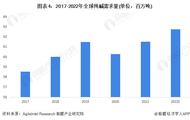 2017-2021年全球纯碱需求量呈现波动上升趋势,2021年需求量达到6200万吨,同比增长2.1%。初步统计,2022年全球纯碱需求达到约6300万吨。