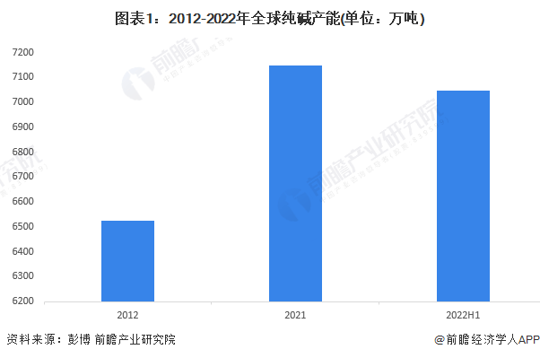 2012-2021年全球纯碱产能整体处于小幅增长趋势,期间产能增量为600多万吨。截止2021年底,全球产能达到7147万吨。截止2022年6月,全球纯碱有效产能为7046万吨。