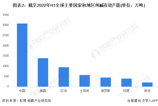 截至2022年6月,中国纯碱有效产能在3000万吨以上,占全球纯碱有效产能的44%;美国有效产能达到1390万吨,欧洲有效产能为951万吨,土耳其有效产能为565万吨,其余国家有效产能均低于500万吨。