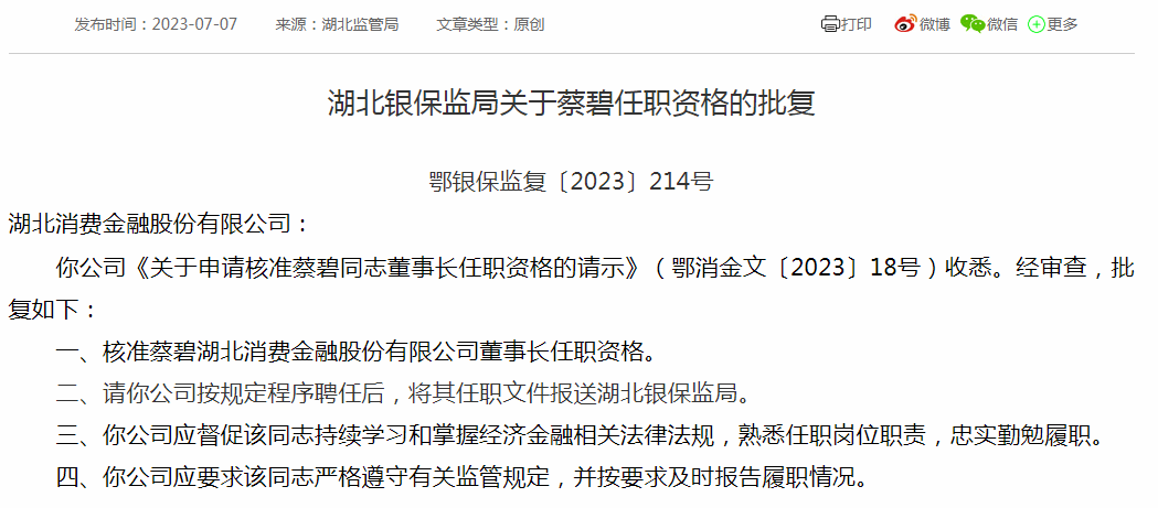 日前,湖北银保监局发布一则批复,蔡碧担任湖北消费金融董事长的任职资格获得该局核准。
