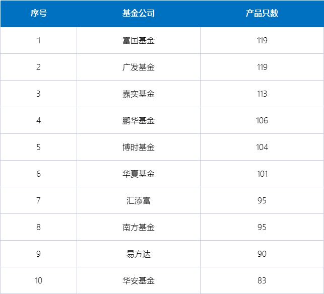 其中,富国和广发最多,涉及119只产品,然后嘉实、鹏华、博时和华夏涉及的产品也都超过100只。
