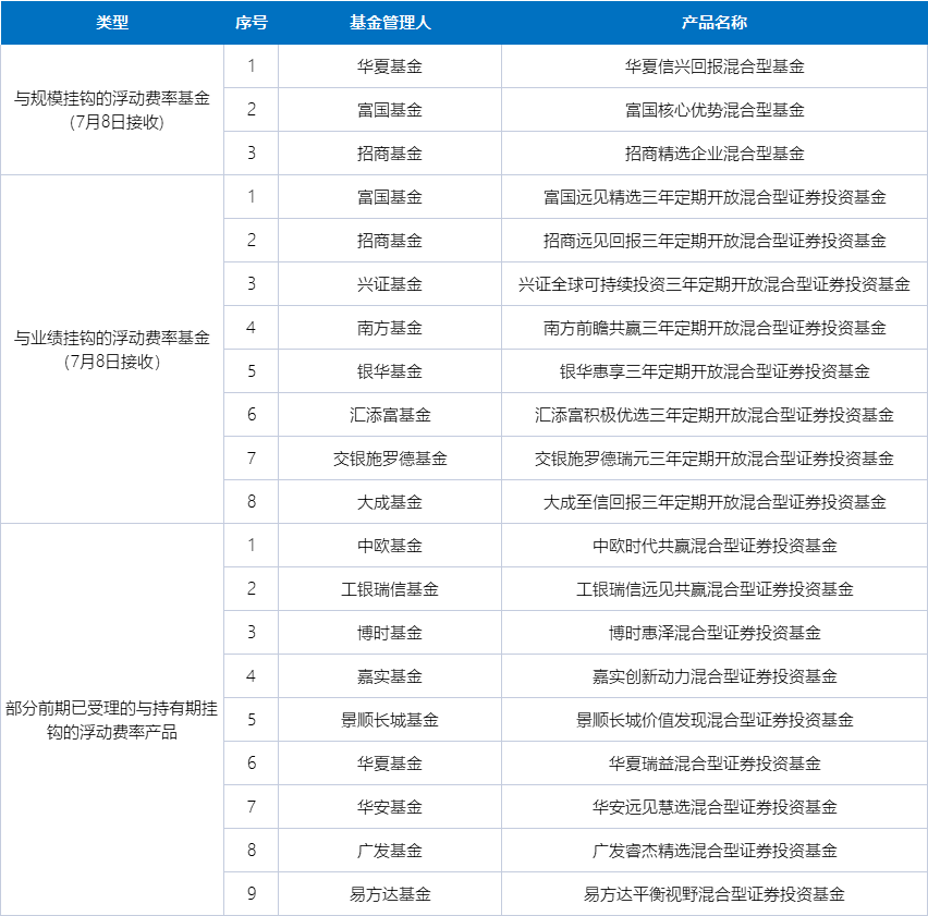 同样在上周六,证监会接收了11只浮动费率基金的募集申请,其中除了8只与业绩挂钩的,还有3只是与规模挂钩的浮动费率基金,即产品管理规模越大,适用的费率水平越低。