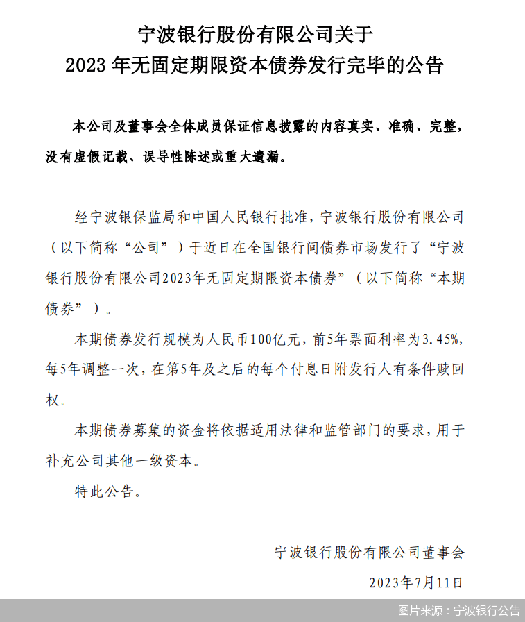 原标题:宁波银行:100亿元无固定期限资本债券发行完毕