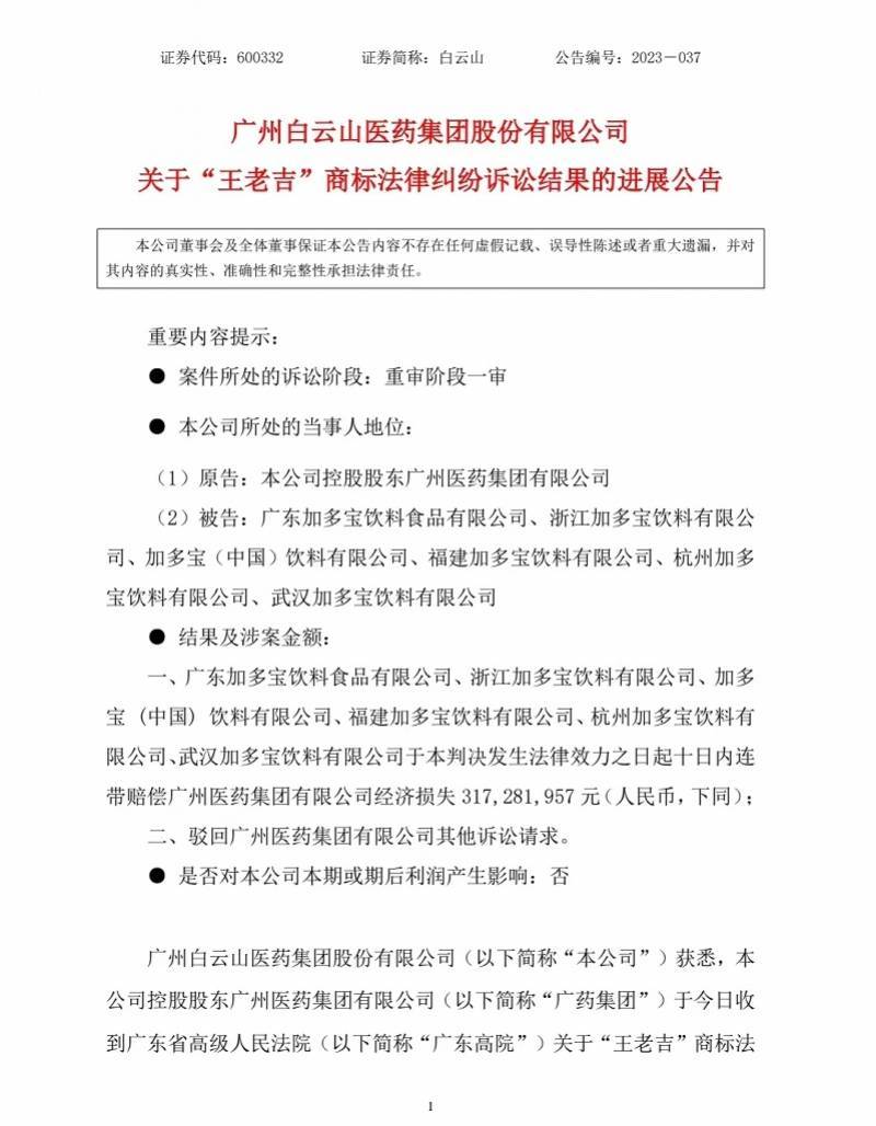 7月10日,加多宝在其官方微信公众号发布《加多宝关于与广药商标纠纷案一审判决的声明》(以下简称“声明”),声明称,加多宝收到广东省高级人民法院关于广药集团与加多宝商标权纠纷案的一审判决。该一审判决认定六加多宝公司共同侵权,判决六加多宝公司赔偿3.17亿元。加多宝称对此判决结果表示遗憾,并将立即向最高人民法院提起上诉。