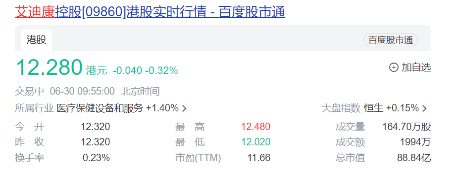 证券代码:HK09860,开盘价12.32港元,截至当日收盘,艾迪康每股报13.80港元,较定价高出12.01%,市值为99.84亿港元。