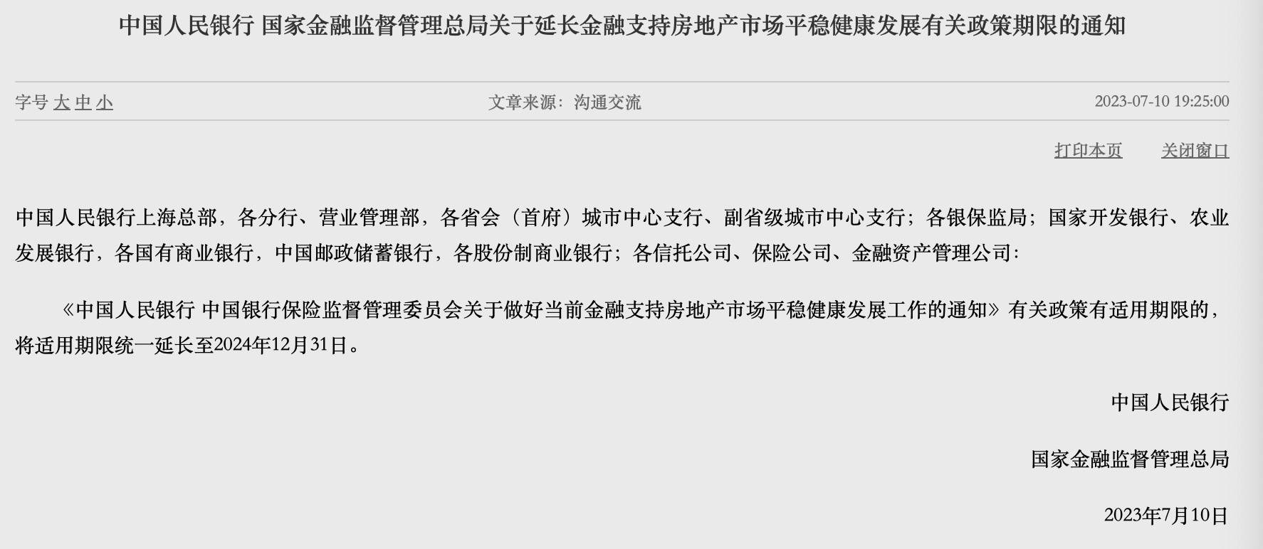 7月10日,中国人民银行、国家金融监督管理总局发布关于延长金融支持房地产市场平稳健康发展有关政策期限的通知。