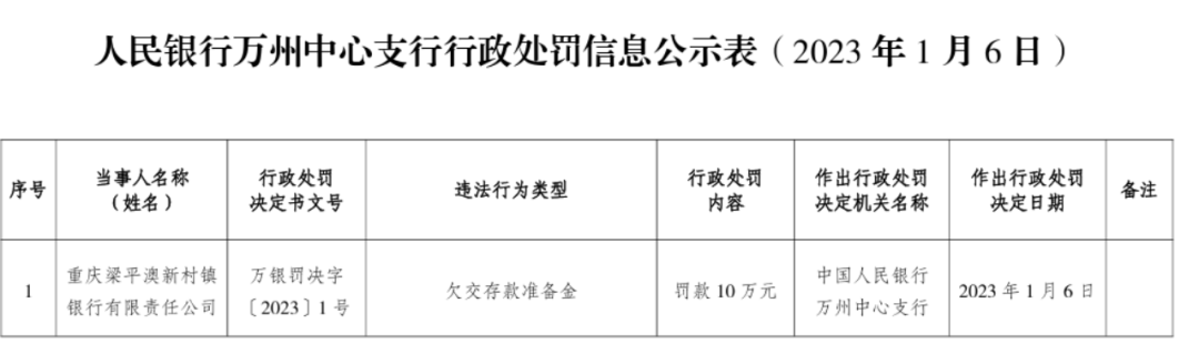 成立近14年,重庆梁平澳新村镇银行展业较为“静悄悄”。2023年初,重庆梁平澳新村镇银行因欠交存款准备金收到中国人民银行万州中心支行的罚单,被罚款10万元,被认为是预计退出市场的前兆。