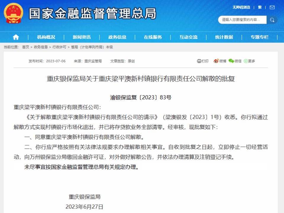 日前,国家金融监督管理总局官网信息显示,重庆银保监局作出关于重庆梁平澳新村镇银行有限责任公司解散的批复,同意该行解散。