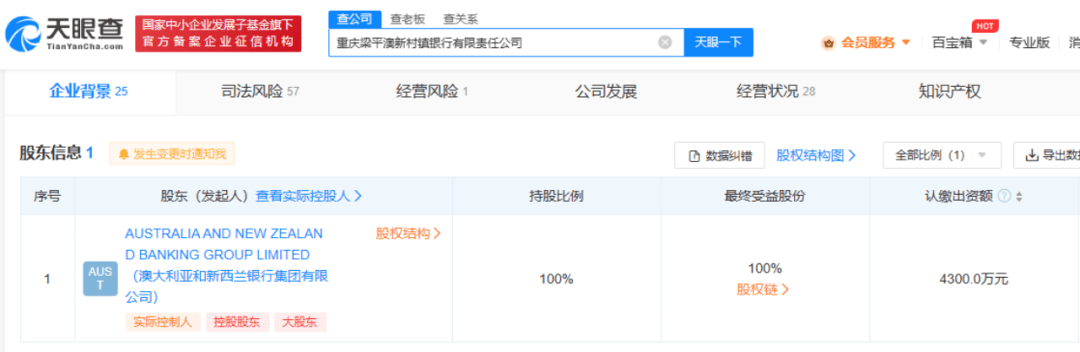 天眼查信息显示,重庆梁平澳新村镇银行是一家外国法人独资银行,注册资本4300万元,由澳大利亚和新西兰银行集团有限公司(澳新银行)出资成立。重庆梁平澳新村镇银行法定代表人、董事长为范静东,同时为澳新银行成都分行行长。
