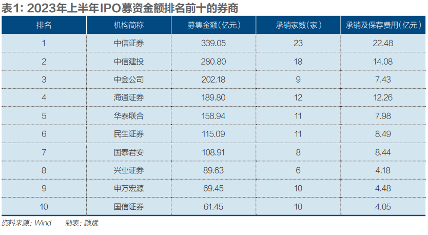 根据Wind数据统计,2023年上半年,排名前十的券商对应的募资金额占全部IPO募资总额的比例从上年同期的81%下降至74%;承销保荐收入也由上年同期的73.20%下降至70.32%。
