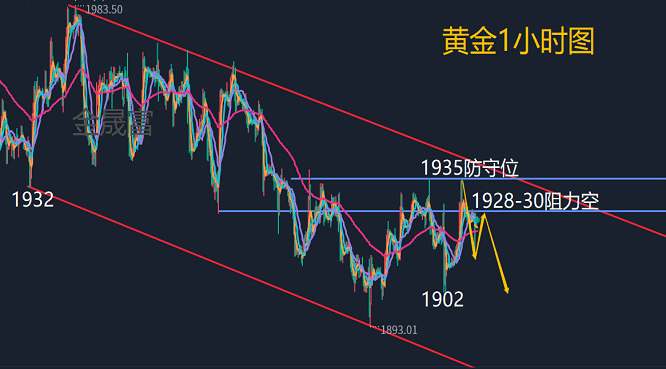 黄金1小时周期于阻力位1935附近接连录得看跌吞没形态、圆顶形态和塔形顶部形态,整体三山顶部形态已成,于阻力位构筑反转形态,经过昨日下跌盘面冲高1935下跌1919反弹1925然后再次下跌1912区域,那么1925凌晨的反弹压力就是今日的做空区域,这里突破就是再次考验1935区域,当然那需要消息刺激,如果弱势反弹遇到1925下方就是再次下跌,那么考验什么位置,就是1850到1935中间关键点1902区域和本次反弹启动点1893位置, 这里如果没有强势反弹那么1867随时回补看多空强弱。综合来看,今日黄金短线操作思路上金晟富建议反弹做空为主,回调做多为辅,上方短期重点关注1928-1930一线阻力,下方短期重点关注1900-1902一线支撑,各位朋友一定要跟上节奏。要控制好仓位及止损问题、严格设止损,切勿抗单操作。近期市场动荡幅度较大,机会与风险并存,控制风险再博收益。