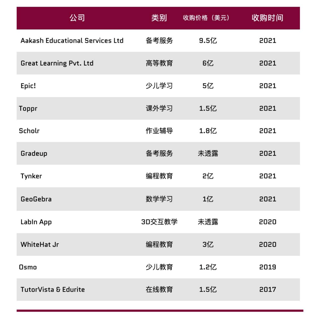 这一年也是BYJU’S走向疯狂的开始。此前,BYJU’S 的收购主要为了增强其原有业务的竞争力,且大多集中在 K12 这一从成立之初就坚守的核心赛道上。但在2020年后,在资本的助推之下,BYJU'S开启了“疯狂买买买模式”,彼时的它似乎已然失去了应有的理智,没有时间认真分析收购的一系列公司是否有价值,或者是否是其真正需要的,在融资扩张的狂欢路上越走越远。据不完全统计,BYJU'S 在2021年至少收购了 8 家公司,花费超过 25亿美元。
