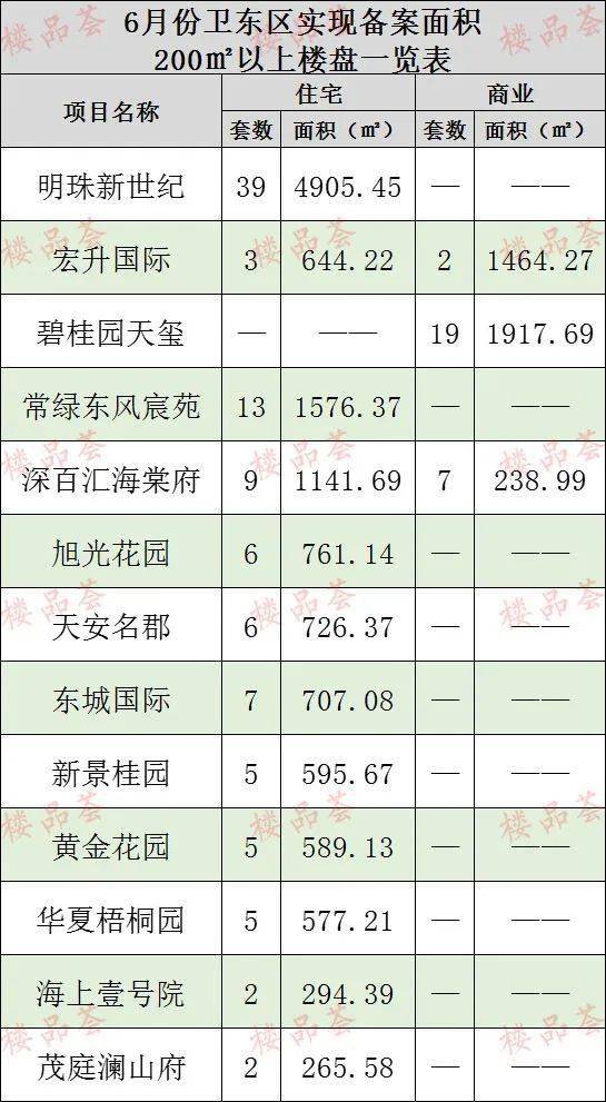 6月份,卫东区2家楼盘进入前十,分别是明珠新世纪(第一)、宏升国际(第十)。