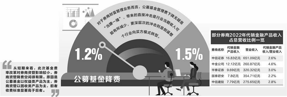 目前来看,不少券商的财富管理业务核心仍然是金融产品代销,公募基金管理费率下调之后,首当其冲的就是相关业务收入。“假设行业平均权益类基金管理费率由1.5%降至1.2%,我们估算行业代销金融产品业务收入将同比下滑12.5%。”华创证券非银分析师徐康在7月9日发布的研究报告中表示。