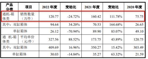 从细分产品来看,在美国减排力度加强影响下,斯贝科技部分产品销量已经出现问题。2022年,斯贝科技通机-箱体类产品销量为120.77万件,较2021年的160.42万件下滑24.72%。
