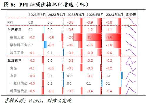 国内外市场需求总体偏弱、大宗商品价格下行以及去年基数较高影响,6月份工业生产者出厂价格(PPI)同比下降5.4%,降幅较上月扩大0.8个百分点。其中,PPI中的生产资料和生活资料分别同比下降6.8%和0.5%,分别较上月回落0.9和0.4个百分点。从环比看,两者环比降幅均有所扩大,生产资料回落的更快。生产资料中,各分项价格降幅均有所扩大,扩大幅度呈现出采掘工业>原材料工业>加工工业的特征,上游行业价格环比下降得更快;生活资料中,食品和耐用消费品环比负增长,而一般日用品和衣着价格环比正增长,显示出受收入改善和预期恢复偏慢影响,终端需求呈现出“必需消费品需求有韧性,耐用消费品需求回落”的分化特征(见图8)。