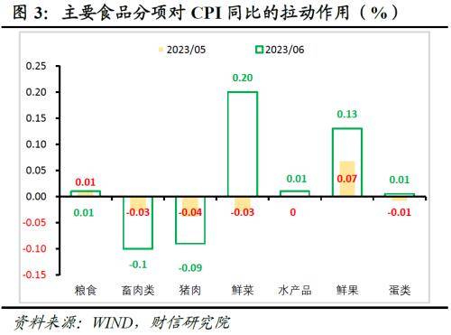 鲜菜支撑食品价格回升较多,猪肉负向拖累有所加剧。6月食品价格环比降幅收窄0.2个百分点至-0.5%,同比涨幅提高1.3个百分点至2.3%,影响CPI上涨约0.44个百分点,较上月提高约0.25个百分点(见图1),对CPI同比增速的支撑作用增强。其中,受高温、降雨等天气影响,鲜菜价格环比由下跌3.4%转为上涨2.3%,加上去年同期基数走低,鲜菜同比增速由下跌1.7%转为上涨10.8%,对CPI同比的拉动作用较上月回升0.23个百分点,是CPI同比回升的主要推动力量;受供给总体充足影响,猪肉价格环比继续下跌,但跌幅收窄0.7个百分点至-1.3%,加上去年同期基数走高,同比跌幅扩大4个百分点至-7.2%,对CPI同比的负向拖累作用提高0.05个百分点;其他主要食品价格环比也出现不同程度的下跌,对CPI同比的拉动作用有所减弱(见图2-3)。