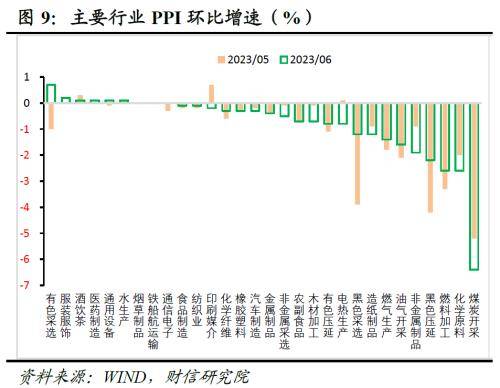 从行业看,上游行业环比继续下跌是PPI降幅扩大的主因。一是受房地产投资持续负增长、煤炭等行业需求进入季节性淡季影响,煤炭开采业、黑色金属冶炼及压延加工业、黑色金属矿采选业、非金属制品业等行业出厂价格环比也均为负增长(见图9),国内投资需求偏弱对PPI的拖累作用有所显现;二是受国际原油价格继续回落影响,海外输入性通缩压力有所增强,如石油煤炭及其他燃料加工业、石油和天然气开采业、化学原料及化学制品制造业等原油产业链出厂价格环比下降较多;三是下游行业价格涨跌互现,服饰服装、医药制造等行业价格会所回升,但纺织、食品制造、化学纤维、汽车制造等行业出厂价格环比均为负,说明下游需求整体也偏弱。