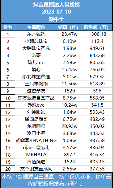 7月10日,抖音直播达人带货榜一是东方甄选,销售额1308.18万;榜二小魏总珠宝,销售额1112.41万;榜三大胖珠宝严选,销售额949.61万。
