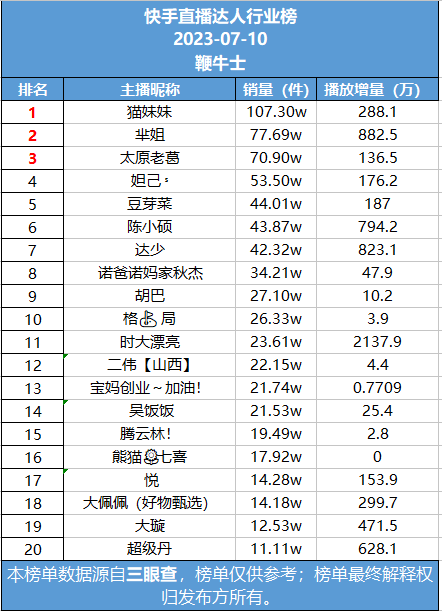快手直播销量榜第一猫妹妹,销量107.30万件,第二芈姐,销量77.69万件,第三太原老葛,销量70.90万件。