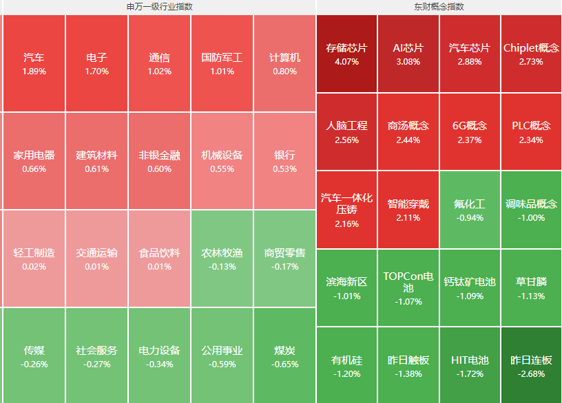 分行业来看,汽车、电子、通信、国防军工、计算机等行业领涨,煤炭、公用事业、电力设备、社会服务、传媒等行业领跌。港股新势力暴涨,蔚来张超10%,理想汽车涨近5%,小鹏汽车张超7%。
