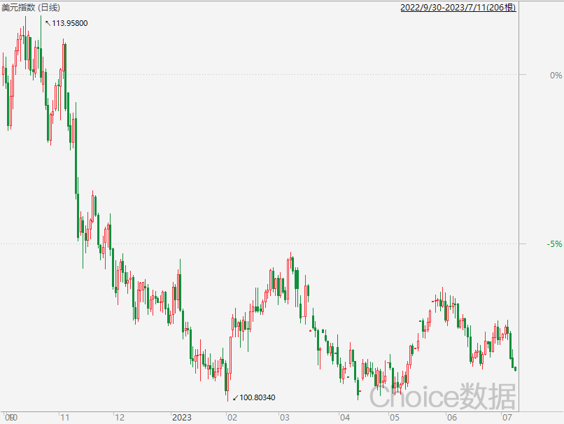 市场对美联储预期有所缓和,昨晚美元指数再次跌破102关口,完全把上周小非农超预期的涨幅给跌没了,创下近期新低,美国十年期国债收益率也跌破了4%,现在就看周三的CPI数据了。如果周三CPI数据继续低于预期,7月份未必加息。另外,近期人民币贬值压力得到缓解,从底部已经升值超700点,可能见底回升。