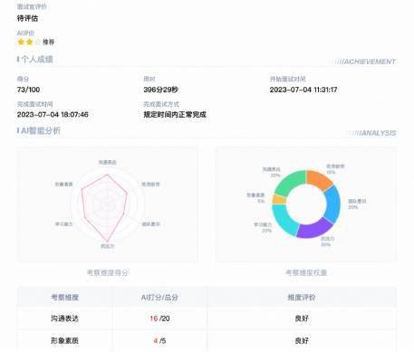 面试结束后,“小紫”会根据求职者的表现和招聘岗位的招聘要求,确定求职者的岗位能力模型,自动生成评估报告,对求职者的各个维度进行打分和做出评价。