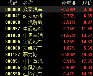汽车整车股快速拉升,众泰汽车涨停,中通客车、一汽解放、安凯客车、赛力斯、中集车辆等跟涨。