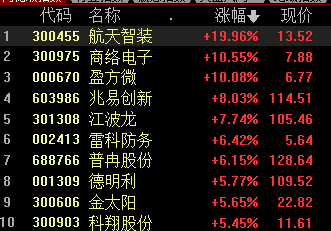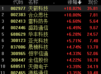 军工板块集体拉升,卫星导航方向领涨,航天智装20cm涨停,天箭科技、合众思壮、上海沪工、凌云股份封板,广哈通信、天银机电涨超10%,亚光科技、中光防雷、雷科防务等涨幅居前。