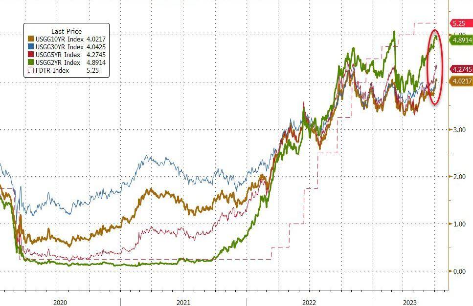 具体来说,同在上周,基准十年期美国国债今年2月以来首次回升到4%以上,两年期美债收益率曾触及5.12%,创2007年6月以来新高;英国十年期国债收益率曾创2008年来新高,突破了去年10月英国养老金危机期间的巅峰水平4.64%。