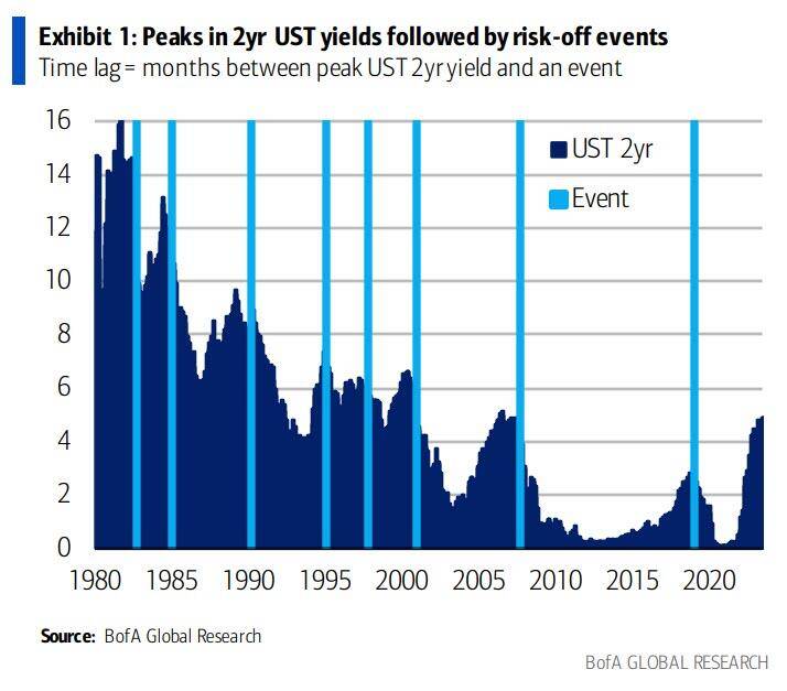 而现在显然还没有到清楚紧缩全部威力的时候。下图显示,过去四十年间,每次两年期美国国债的收益率达到当地的巅峰后,都会发生某种风险负面的事件。