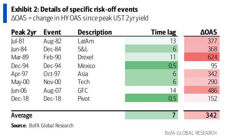 两年期美债收益率达到峰值和随后发生时间的滞后期不等,短的只有几周,长的有一年多,平均滞后期为七个月。那么,如果这次指标又准确预警了,可能会发生什么事件?