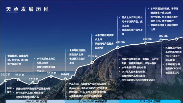 根据天承科技招股书资料,截至2022年底,公司为54条高端PCB水平沉铜线供应产品,市场占有率仅次于安美特。其中,2019年至2022年底,共有11条高端PCB生产线的供应商由安美特切换成天承科技;电镀领域,公司是目前市场上除安美特外唯一能搭配水平电镀设备提供专用电子化学品的厂商,已在超毅、方正科技替换安美特部分产线进行量产,近年来还开发出不溶性阳极直流电镀填孔产品并投入市场使用。