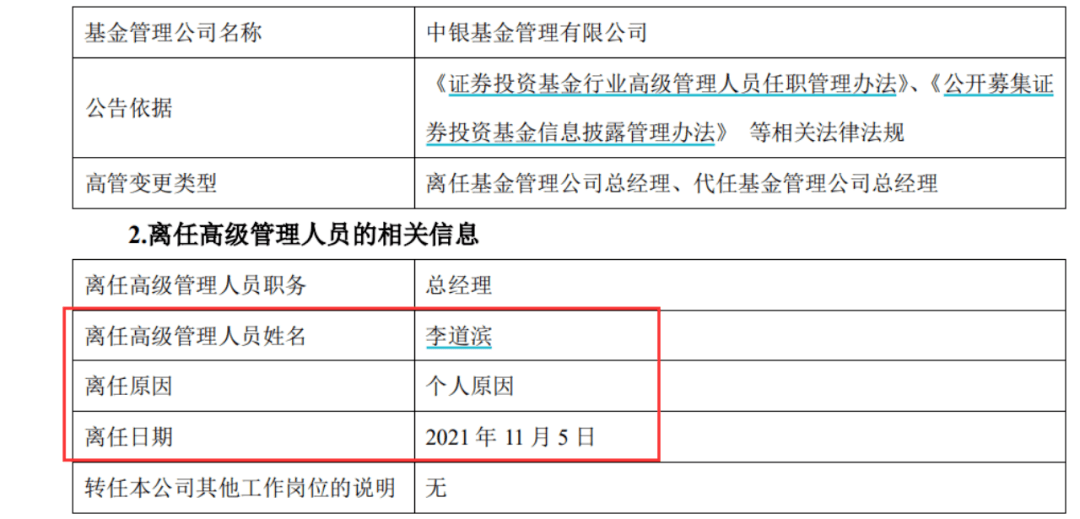 2021年11月5日晚间,中银基金通过深交所发布高级管理人员变更的公告,公告中称,总经理李道滨因个人原因于11月5日离职,董事长章砚代任总经理一职。