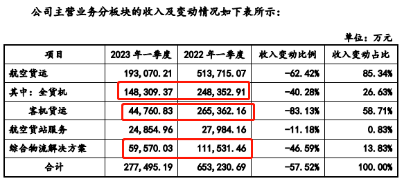 如此看来,客机货班业务似乎是“特殊情况产生”的临时性解决方案,其与客机腹舱业务合并起来的“客机货运”项目,更能体现整个市场的状况。而2023年一季度,公司“客机货运”项目的收入同比大幅下降83.13%。