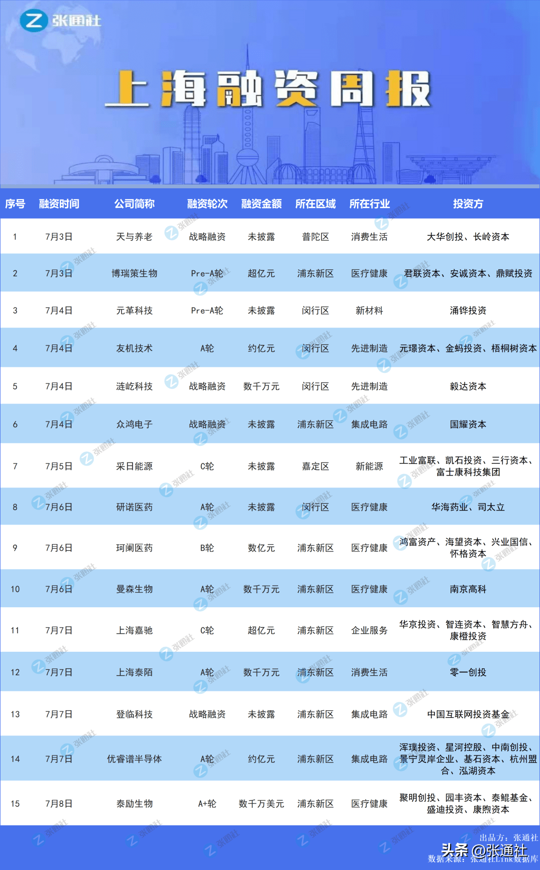 根据张通社Link数据库统计,本周(7.3-7.9),上海发生15起融资事件,合计融资金额估算超10亿元。除去未披露的,融资金额达亿元人民币的有4起。
