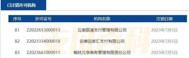 3张被注销的支付牌照分别是云南银通支付管理有限公司、安徽百家汇支付有限公司、榆林元亨商务管理有限责任公司,由于没有续展,三张支付牌照有效期停留在了2023年7月5日。