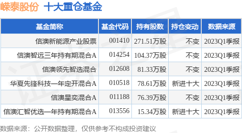 根据2023Q1季报公募基金重仓股数据,重仓该股的公募基金共6家,其中持有数量最多的公募基金为信澳新能源产业股票。信澳新能源产业股票目前规模为107.16亿元,最新净值3.72(7月10日),较上一交易日下跌0.24%,近一年下跌22.44%。该公募基金现任基金经理为冯明远。冯明远在任的基金产品包括:信澳科技创新一年定开混合A,管理时间为2020年5月29日至今,期间收益率为15.86%;信澳研究优选混合A,管理时间为2020年6月22日至今,期间收益率为12.54%;信澳星奕混合A,管理时间为2021年1月22日至今,期间收益率为5.84%。
